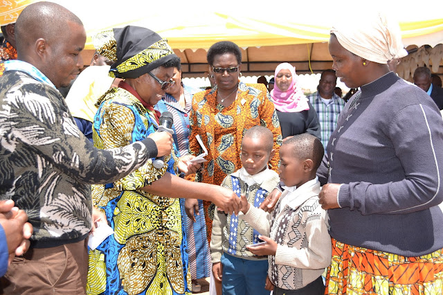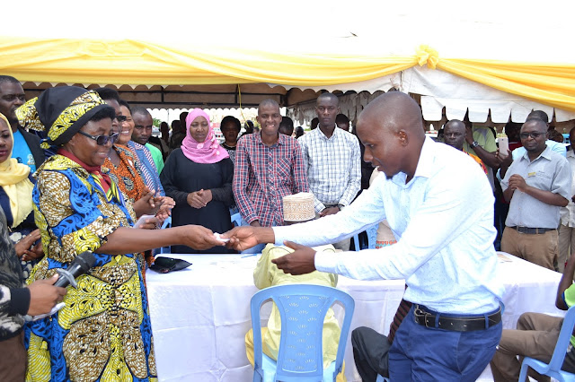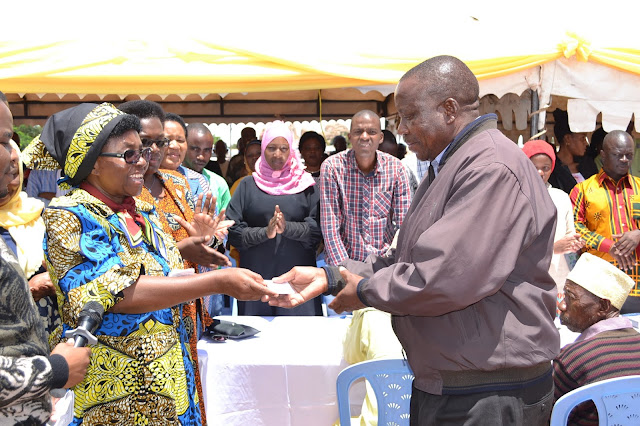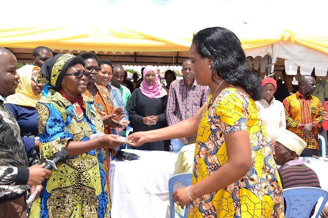Mganga mkuu wa mkoa wa Singida Dkt. Victoria Ludovick akichangia huduma ya CHF iliyoboreshwa kwa ajili ya mwananchi mmoja (mama mjane, wa kwanza kulia) ili aweze kupatiwa kadi ya huduma ya afya ya CHF iliyoboreshwa, wakati wa kilele cha uzinduzi wa mfuko wa bima ya afya ya jamii (CHF) ulioboreshwa, mkoani Singida.