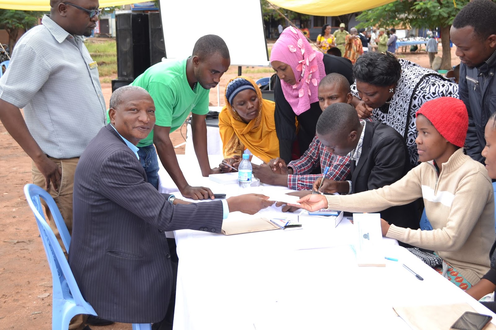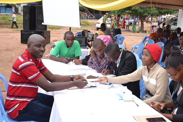 Huduma za usajili wa BIMA iliyoboreshwa zikiendelea kutolewa kwa wananchi katika uwanja wa zamani wa stand ya mabasi katika Manispaa ya Singida, wakati wa kilele cha uzinduzi wa mfuko wa bima ya afya ya jamii (CHF) ulioboreshwa, mkoani Singida.